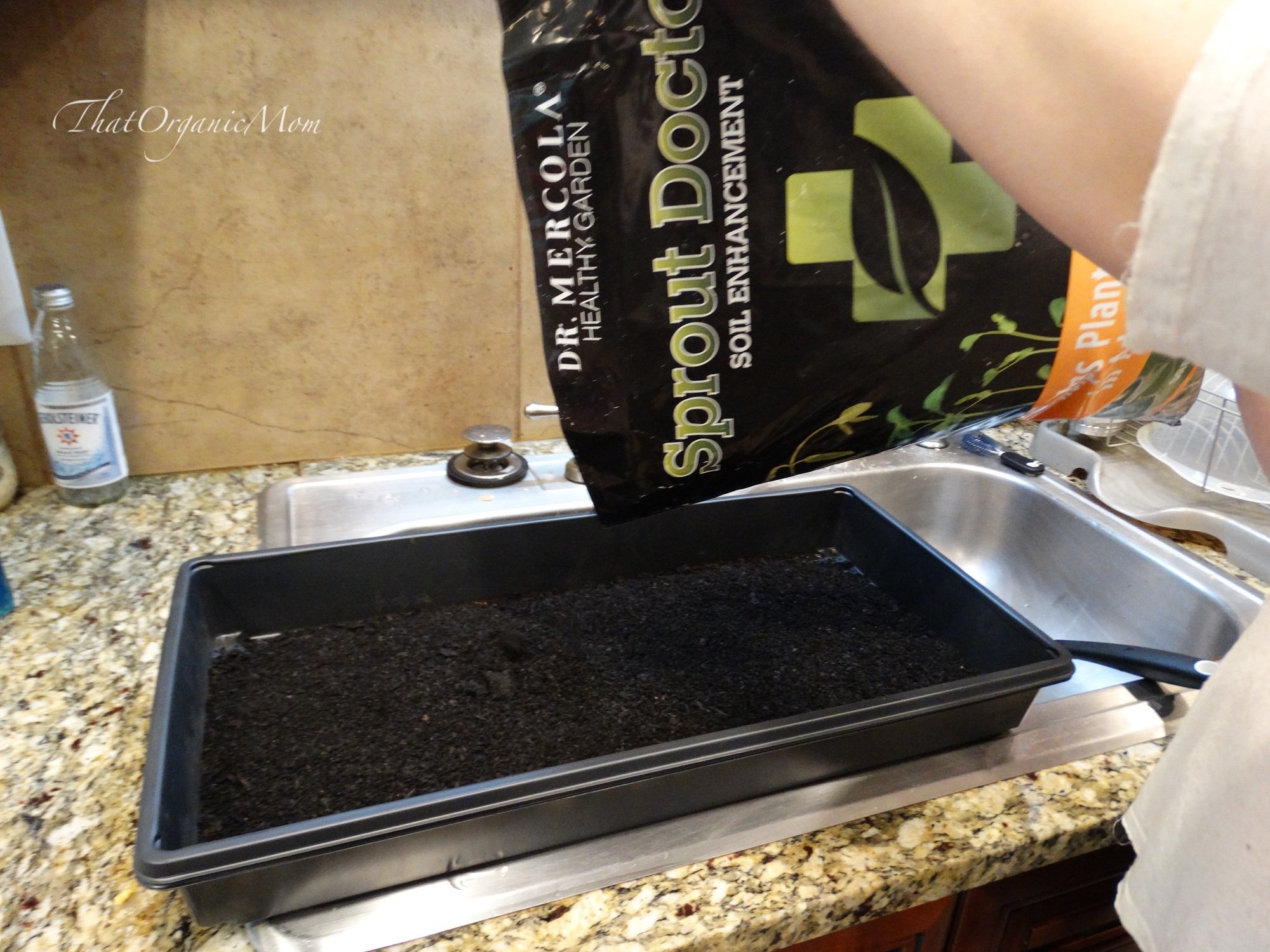 - Pour the seeds into the mesh sprouting tray, spread evenly, rinse I use my sink sprayer.