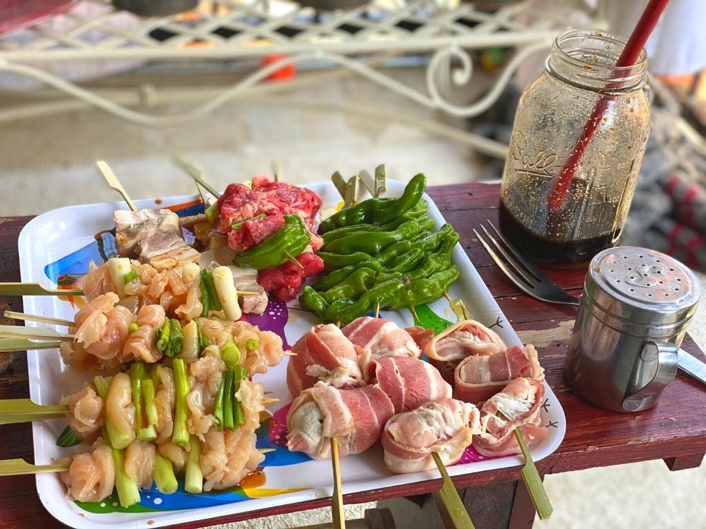 Preparing the skewers is the biggest part of prep time. Traditionally, a chef would start with an entire bird, using the skin and organs, as well as the meat. If you prefer it, you can buy meat already off the bone. Meat with the skin on will be juicier and tastier, but use what you have.