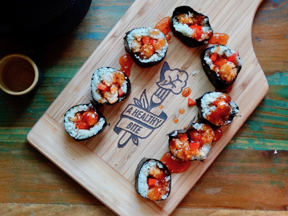 Tempura is batter-dipped and fried vegetables, fish, or meat. While tempura is pretty tasty, I try to limit how much I fry foods. If you like tempura inside rolls and don't mind the mess of frying, go ahead and give it a try! Recently we used baked coconut shrimp inside of sushi rolls and it was amazing. Drizzle a bit of Ginger People's Sweet Chili on top.