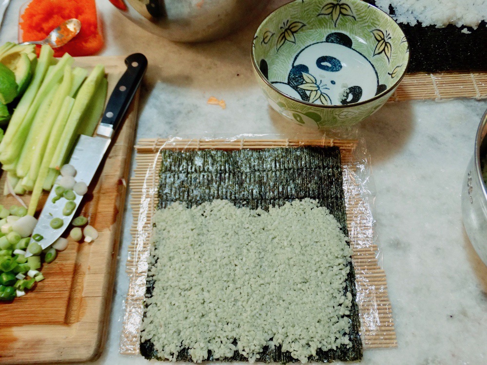 When I taught my kids to make sushi, I found it was easier to wrap the nori on the outside, and doing it this way means you won't need plastic wrap and I'm all about eliminating plastic so if you choose to go this route here's the technique I use.