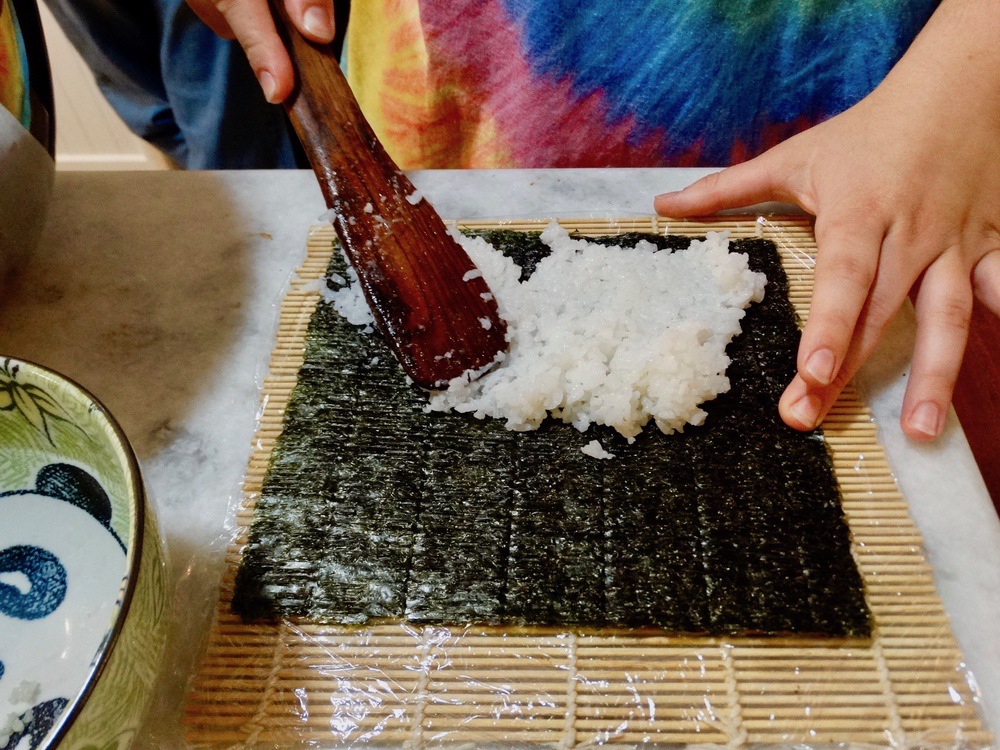 I don't like to use plastic, and did so in this post for demonstration purposes only. The wooden paddle my daughter Ivy is using in the photo above was made by my dad as a butter paddle but I've adapted it for making sushi!