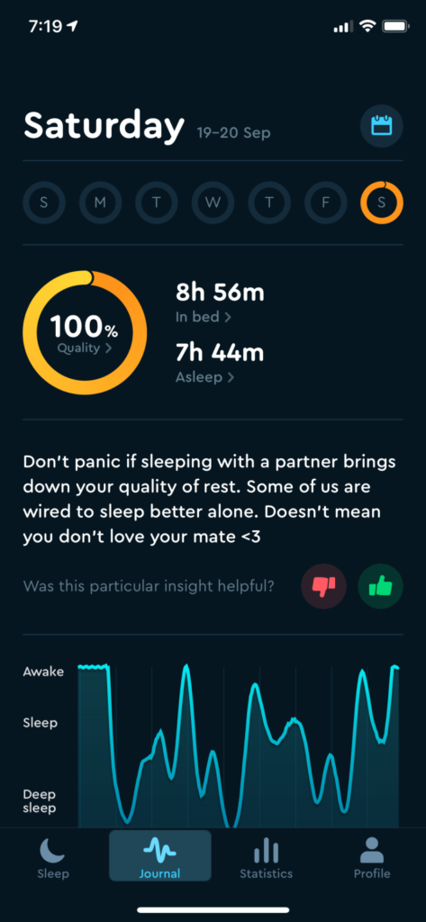 When I woke up the first morning after sleeping grounded, I was astonished. Not only was it later than usual, but when I looked at my sleep tracker, it said I had 100% sleep efficiency! See the screenshot below: