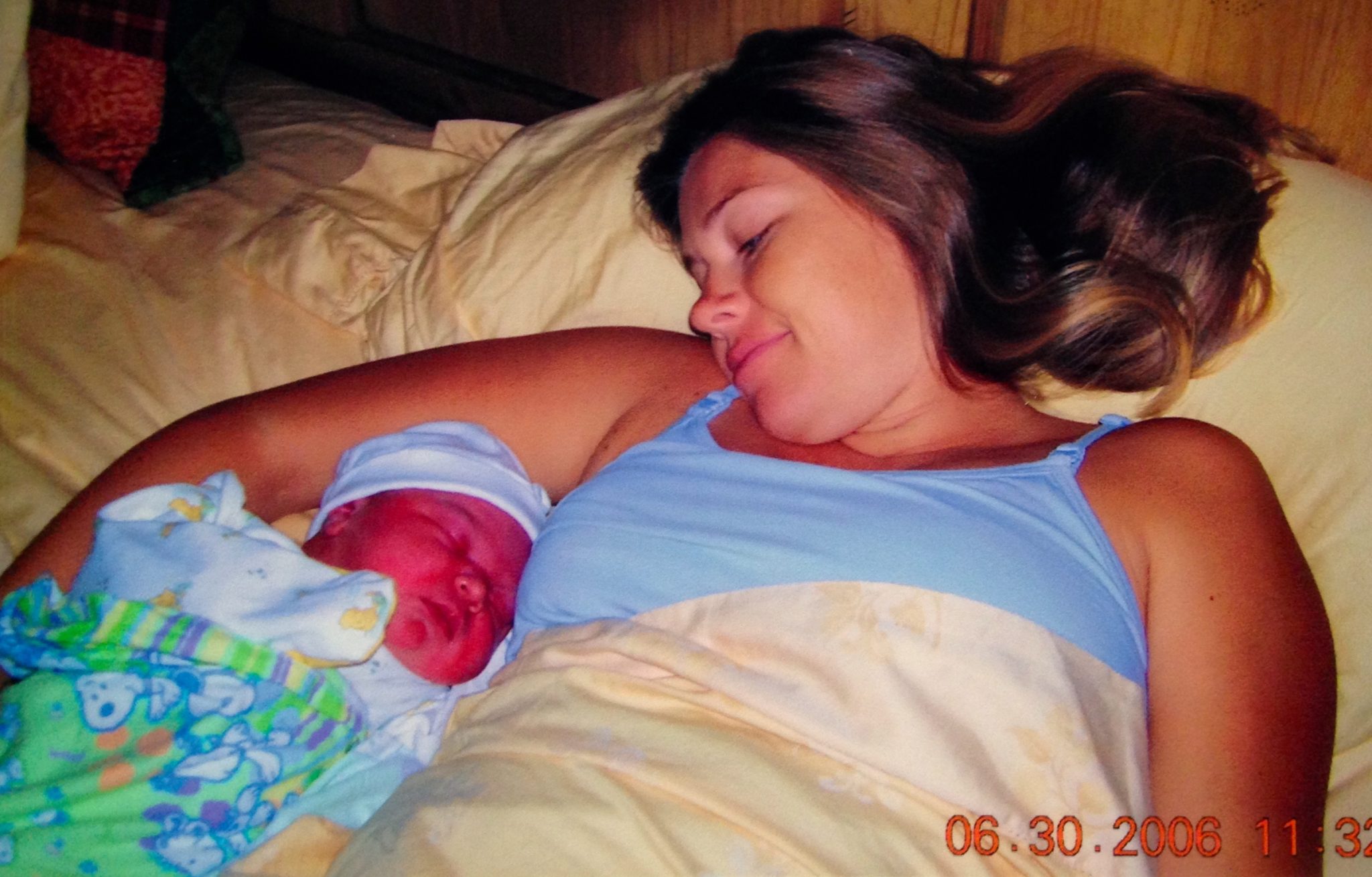 The baby's chest was bigger around than his head, so I still had a lot of pushing to do. Apparently, that is what everyone was screaming at me to do!! (they all apologized later, but I don't even remember it) My midwife told me to flip over to my back, and somehow I did. Then after what I thought was my attempt to push the rest of the baby out, she reached in…ouch…and got ahold of the baby and pulled him out. (she had to brace her foot on the edge of my bed and use it as leverage to pull this baby out!!!!!)