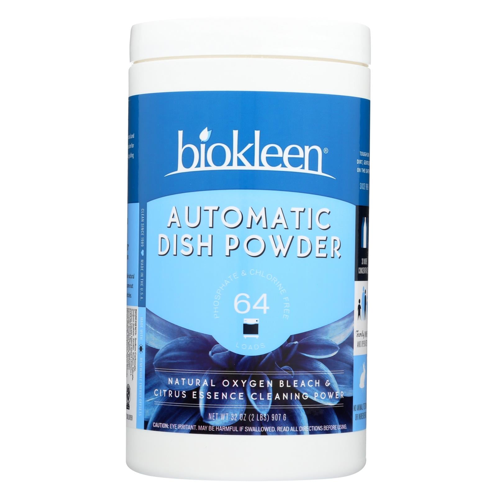 - Description:Biokleen Automatic Dish Powder with Natural Oxygen Bleach Description: Tough on Dirt, Gentle on the Earth Phosphate and Chlorine Free 3x More Concentrated - 64 Full Loads Grapefruit Seed and Orange Peel Extract Cleaning Power Oxygen Bleach to Remove Stain