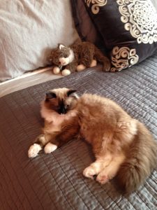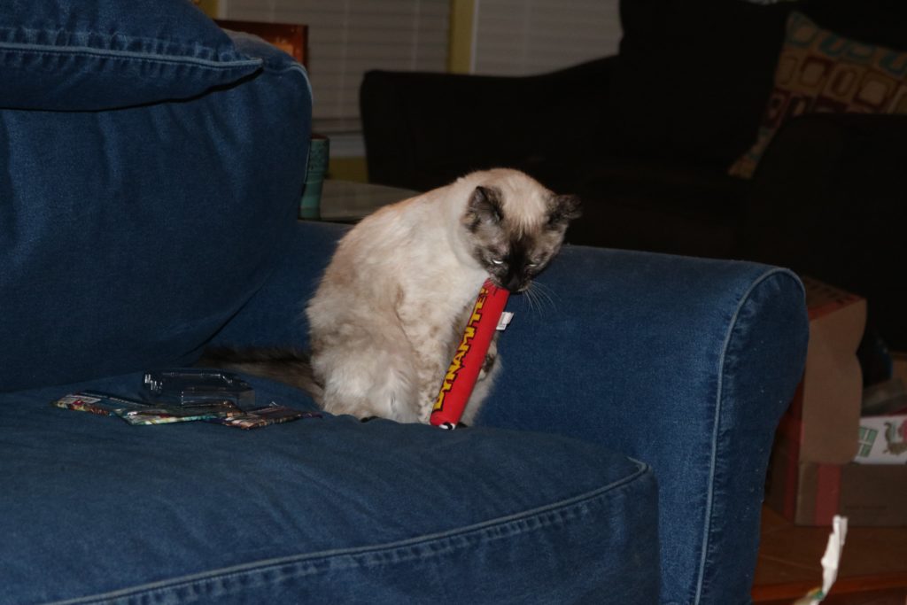 Here is our adopted kitty Half-moon playing with a Dynamite Catnip Stick!