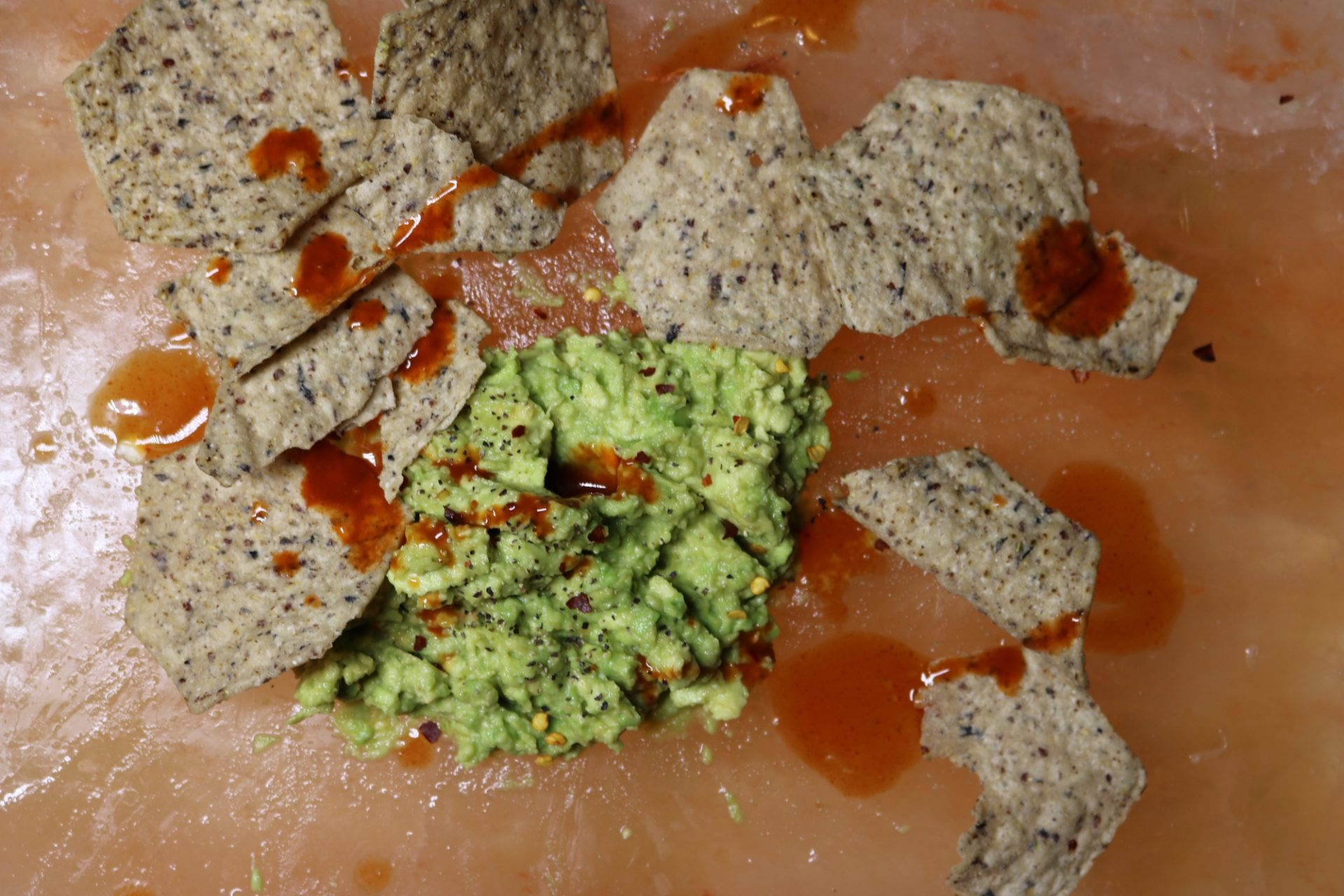 As much as that sounds like a really great album, smashing avocados on a salt block is what we are talking about! Seedy chips and hot sauce make excellent accompaniments to the guacamole.
