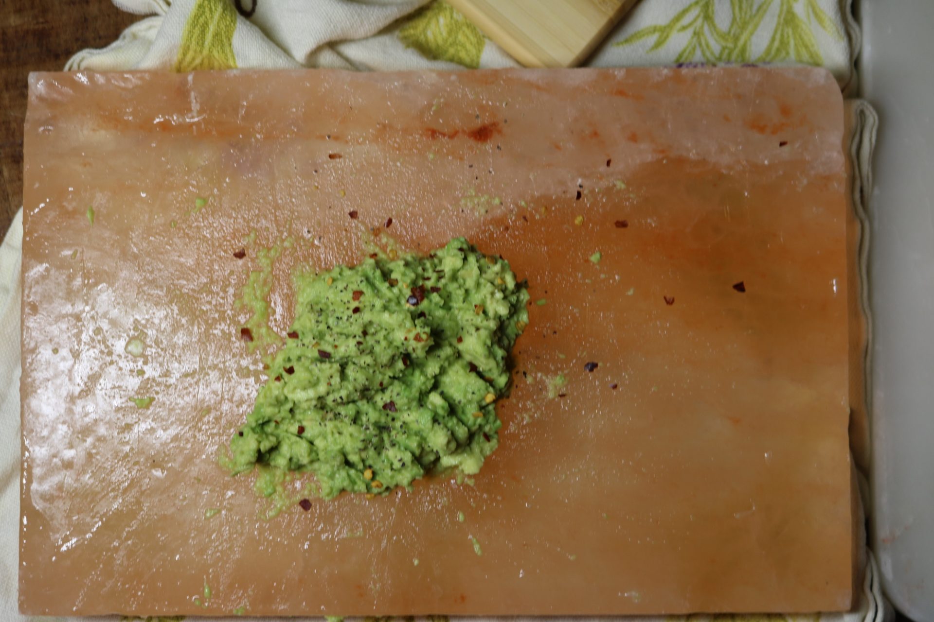 - Cut avocado in half and scoop onto salt block.