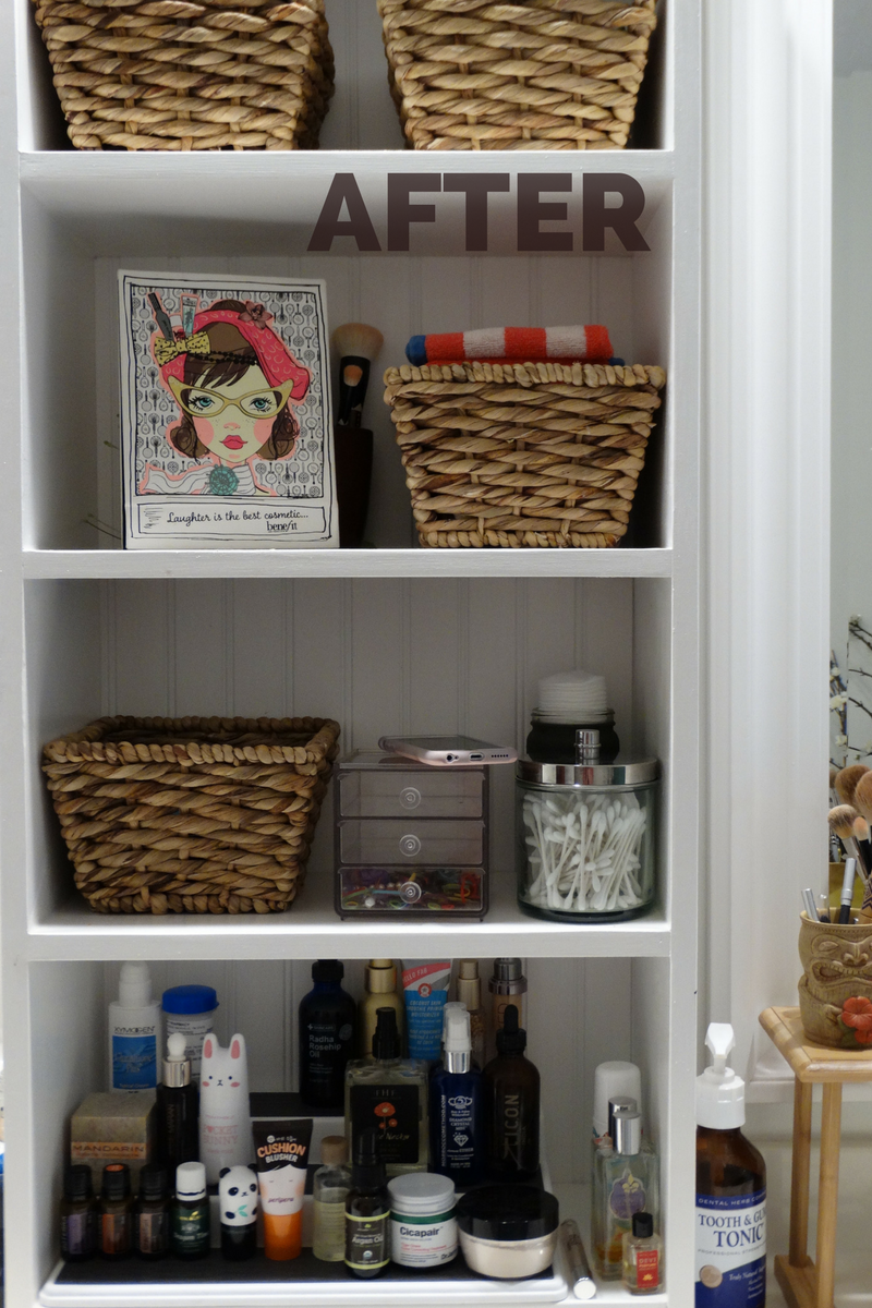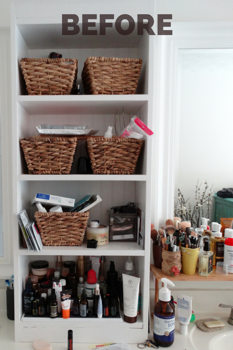 My husband built this shelf and bought some baskets so that I could store my stuff without having to bend down and get things out from under the bathroom cabinet constantly. Out of sight is where Kondo recommends keeping products. What I keep on these shelves are items I use multiple times per day like essential oils, lotions, make up, etc.